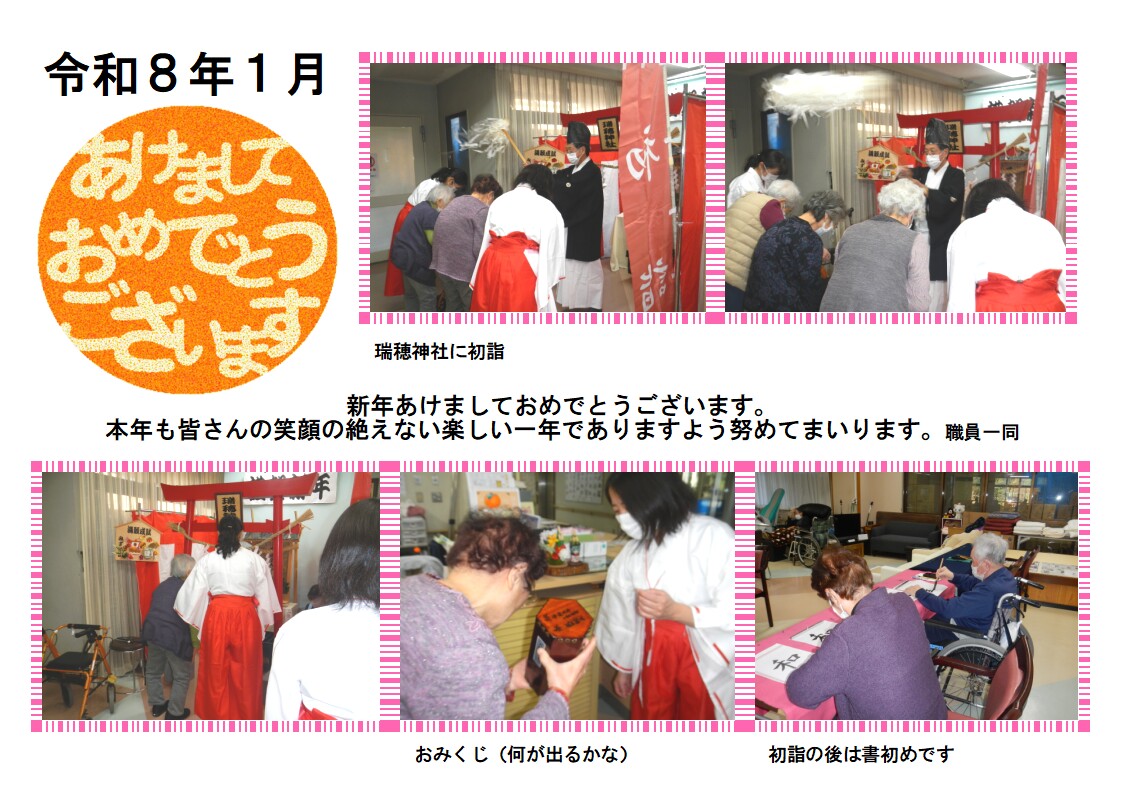 1/4は瑞穂神社で初詣を行いました。手作りの神社に職員の神主さんと巫女さんとてもリアルです。